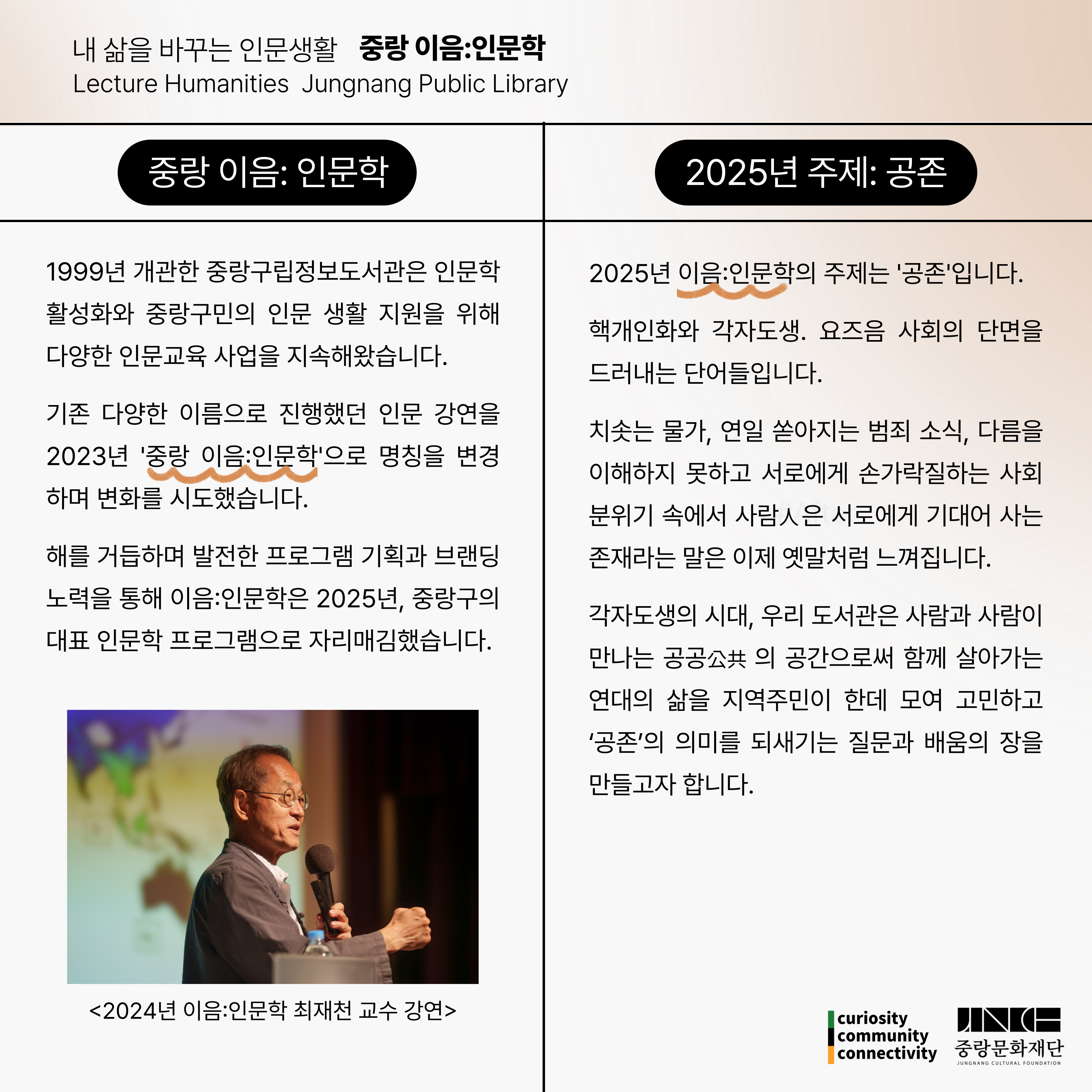 * 중랑 이음인문학은 유료 강좌입니다. (5,000원, 도서관 홈페이지(문화강좌신청 ▶ 신청조회)에서 결제 가능)