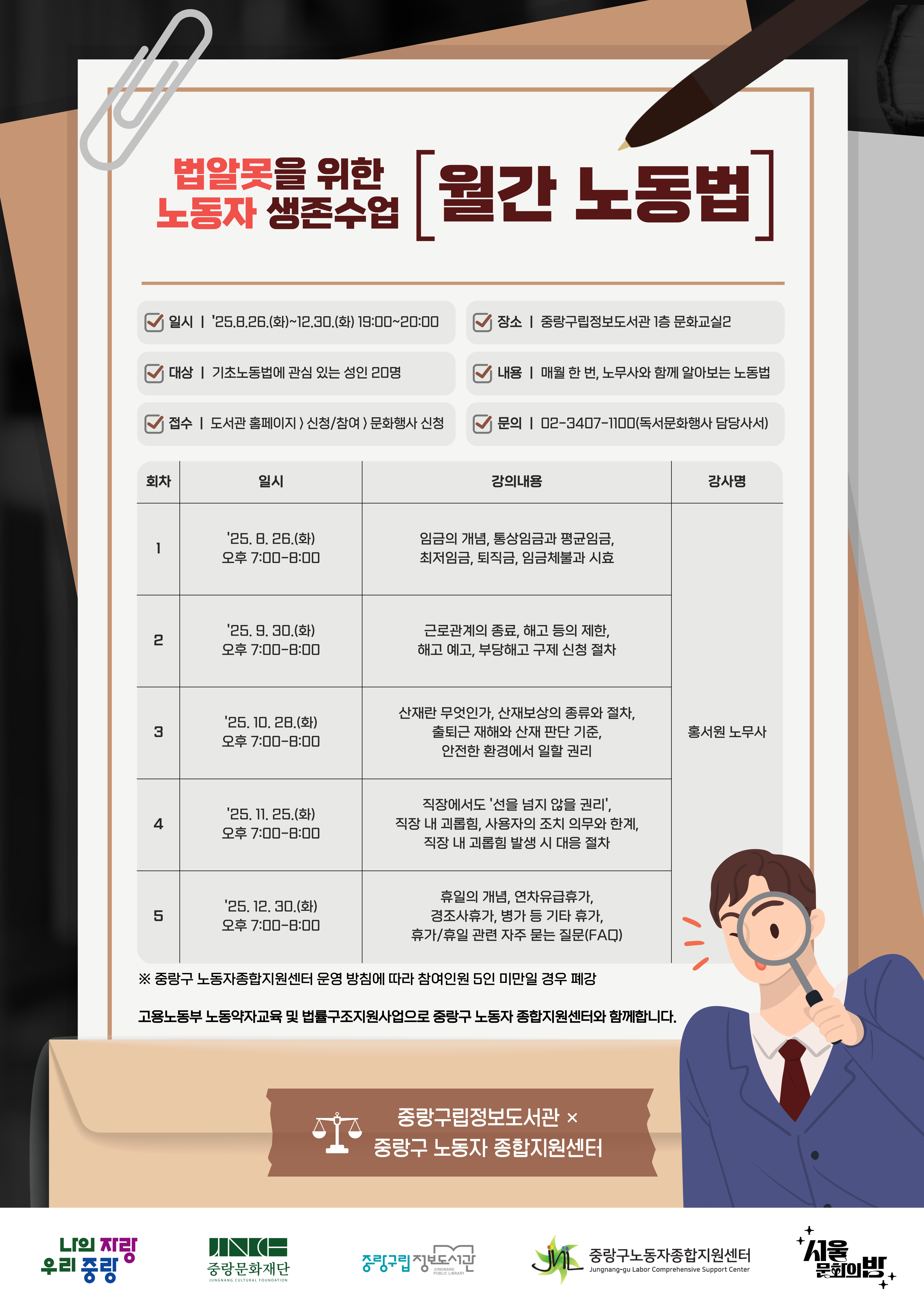 중랑구 노동자 종합지원센터와 중랑구립정보도서관이 함께하는 기초노동법 특강이 운영됩니다.