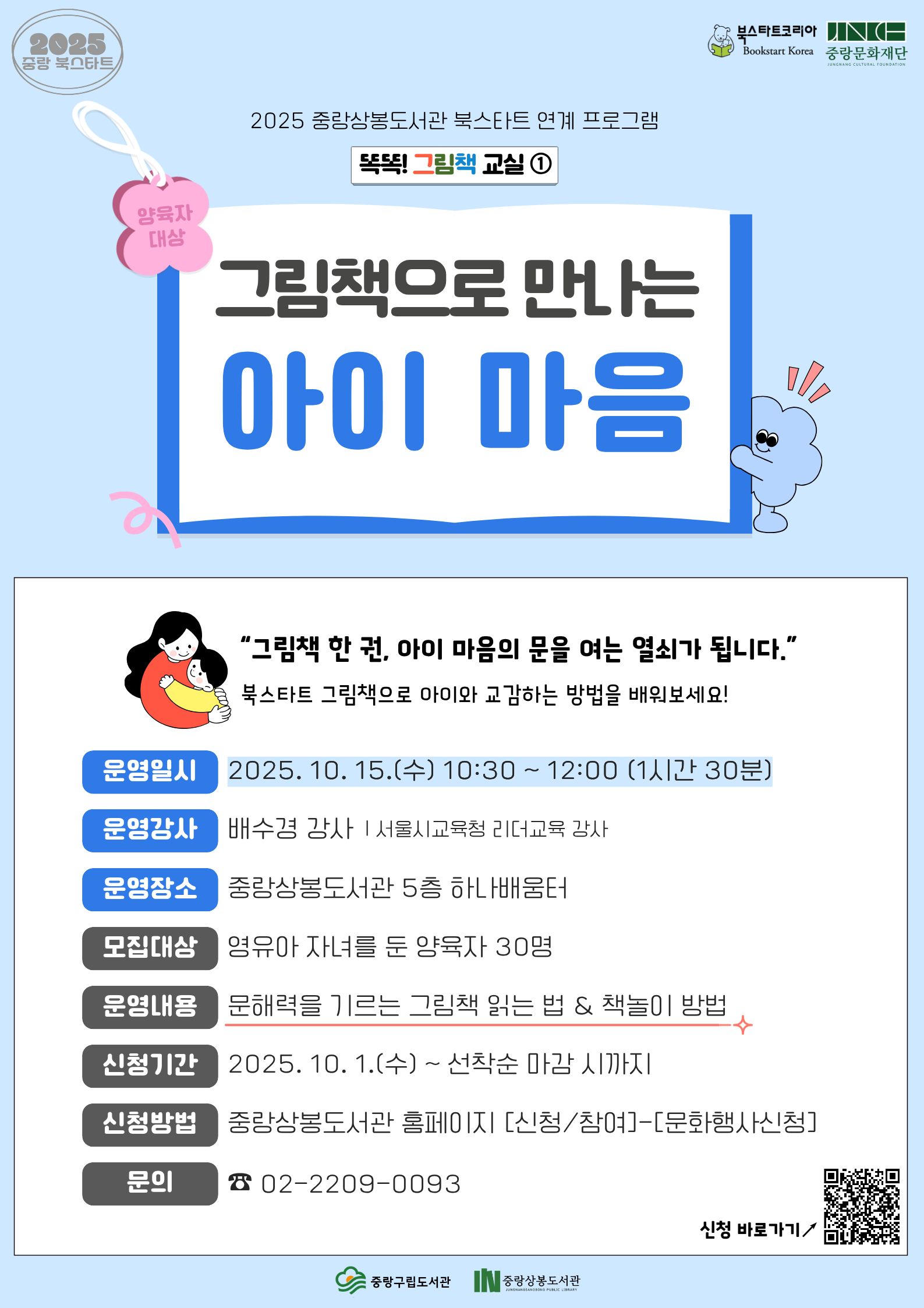 ● 문의: 중랑상봉도서관 유아어린이 자료실 (02-2209-0093, 안내음성 후 3번)