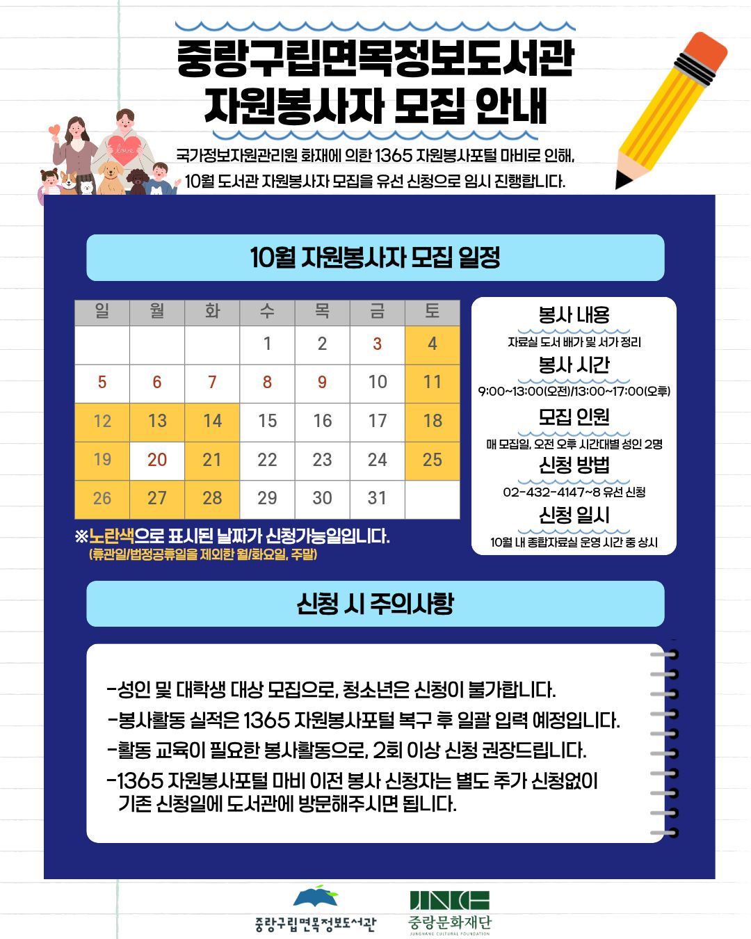 2025년 10월 면목정보도서관에서 활동해주실 자원봉사자를 아래와 같이 유선으로 모집합니다.